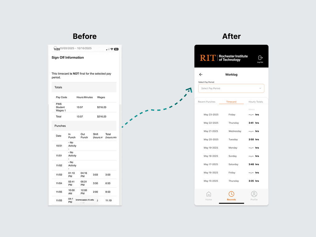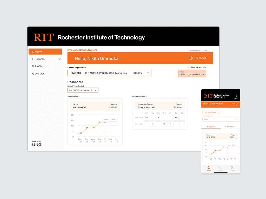 Created a welcoming first impression by unifying RIT's visual identity with Kronos, building trust and familiarity from the moment students log in.