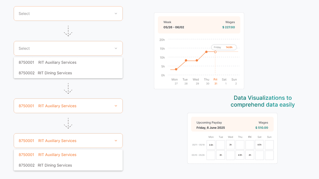Intuitive dropdown for switching between roles and viewing corresponding timecards, making compliance tracking effortless for students with multiple campus jobs.