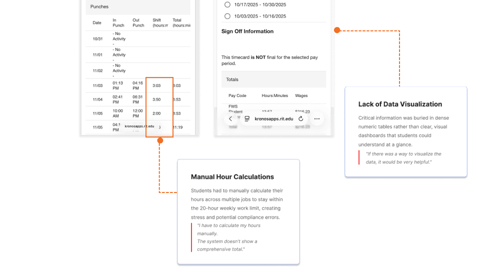 Student workers on campus juggling multiple on-campus jobs faced manual calculations, confusing terminology, and poor mobile experiences—leading to compliance anxiety and low adoption.